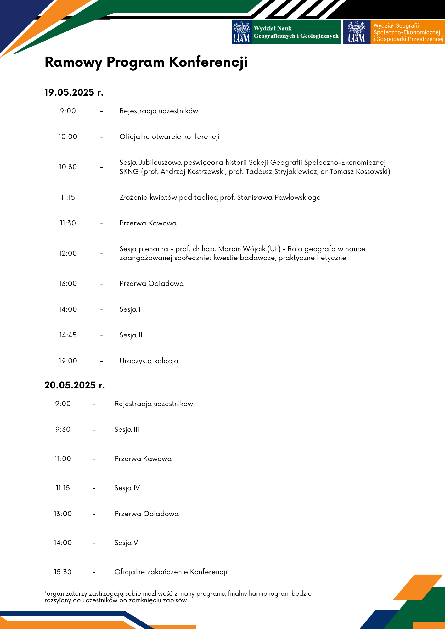 Pierwszego dnia w trakcie Sesji Jubileuszowej prof. Andrzej Kostrzewski, prof. Tadeusz Stryjakiewicz oraz dr Tomasz Kossowski przedstawią historię Sekcji Geografii Społeczno-Ekonomicznej SKNG.